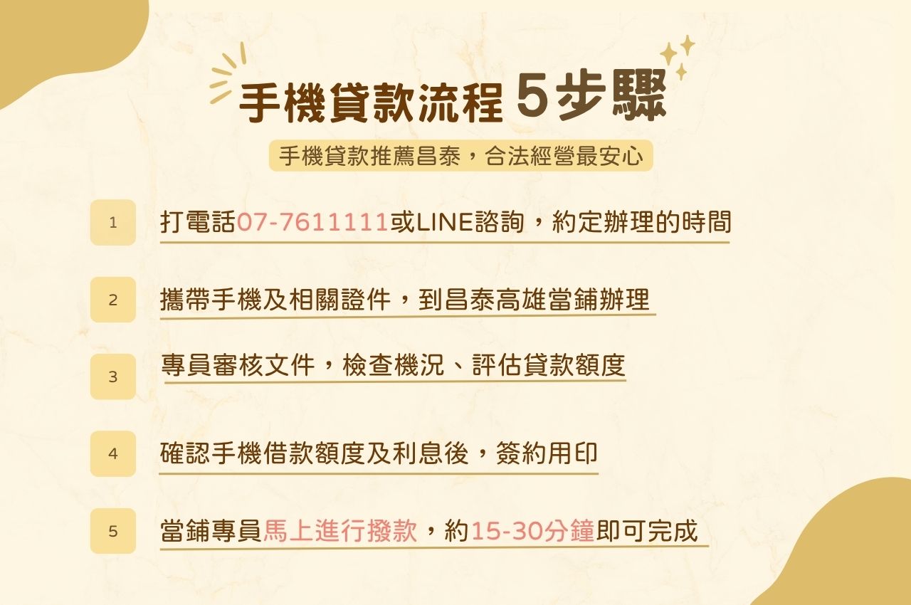 手機貸款推薦找昌泰高雄當鋪,我們是政府合法立案的高雄手機借款當鋪,手機貸款當日撥款,申辦相當速度快,大約15-30分鐘即可馬上撥款。